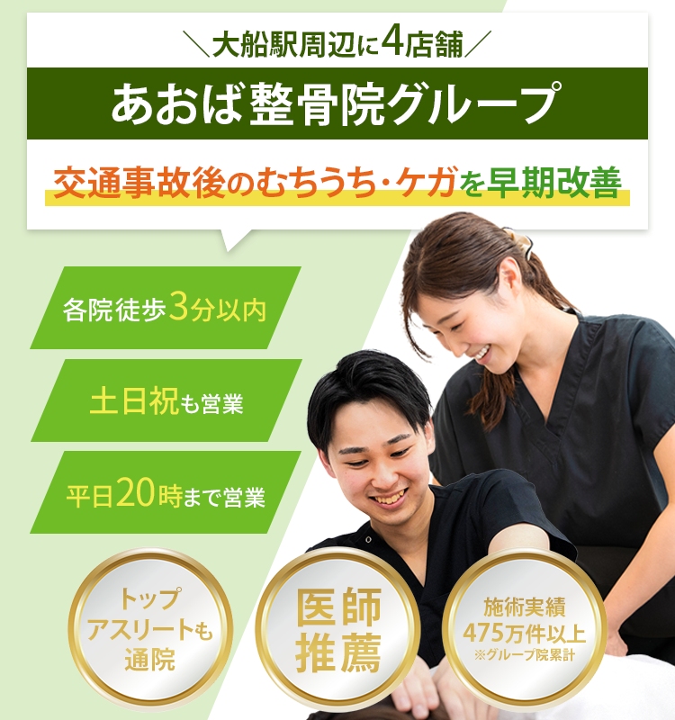 交通事故に遭うと、多くの方が首の痛み=「むち打ち」になり、事故前の身体に戻るまでには長い時間がかかる場合があります。